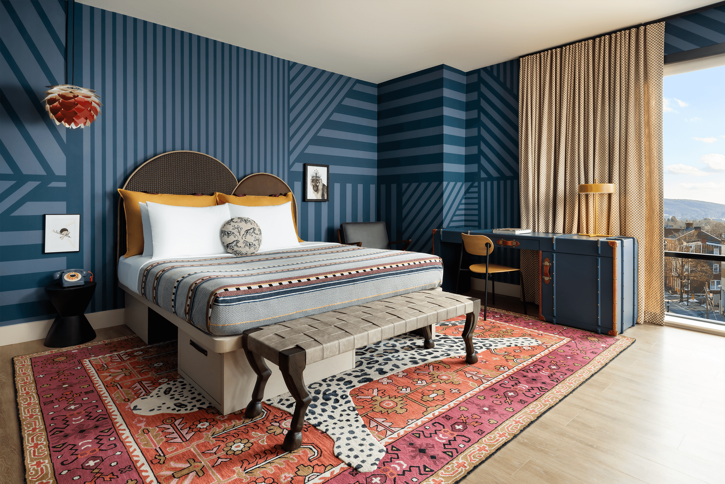 Though the hotel lobby appears to exist in a world of its own, playfully eccentric connections to Pennsylvania’s Dorney Park, decadent curtains alluding to the nearby theatre district, and stylish, avant-garde references to historic Hess’s department store anchor the building in a local context.