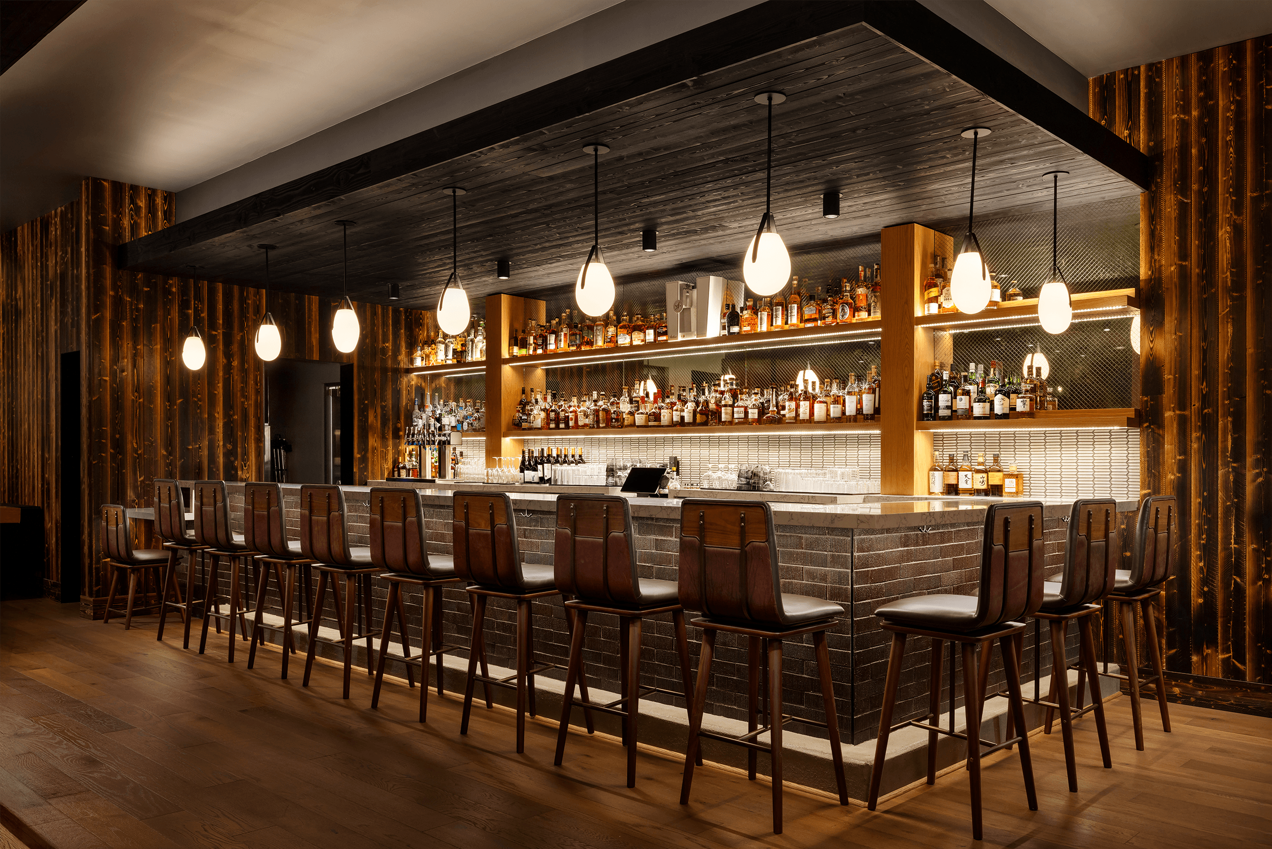 Woven textures in lounge furniture evoke the dried wheat and barley used to make liquor while rich amber and cognac wood tones immerse patrons in the warmth of American made spirits.