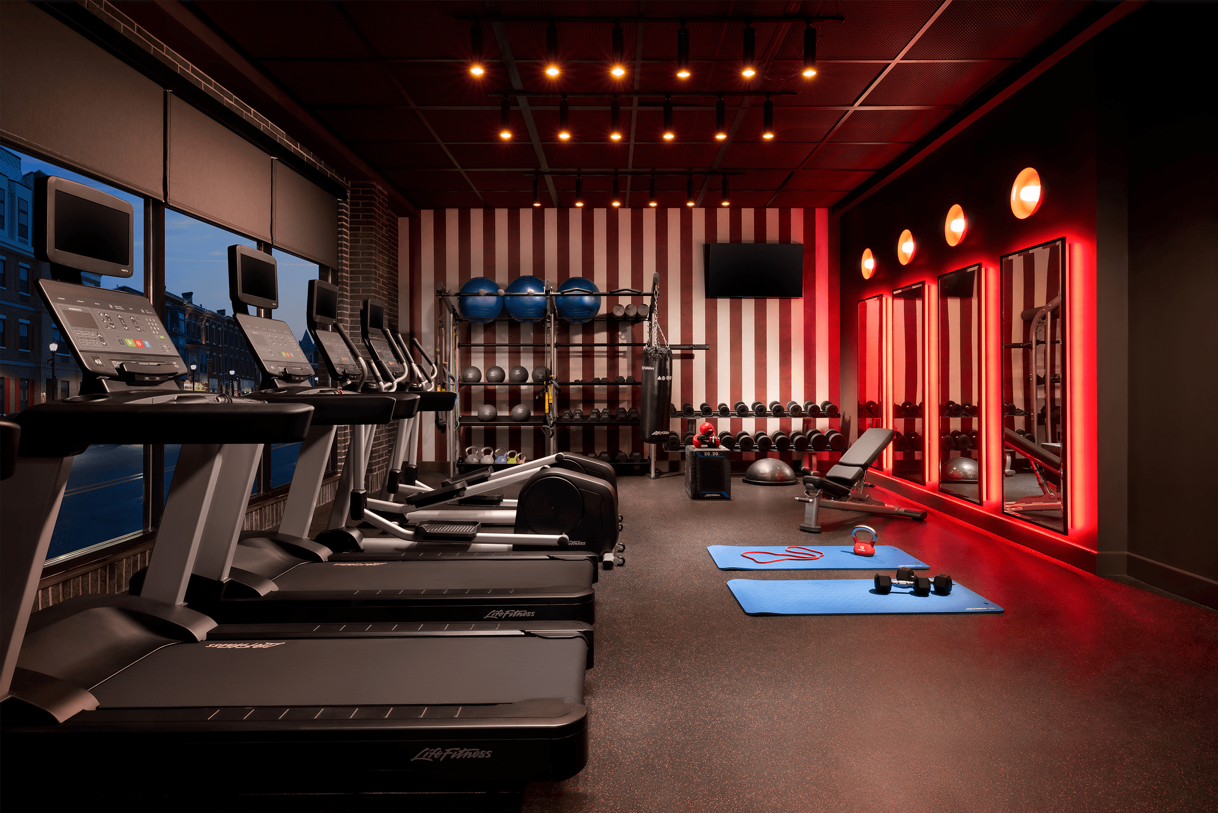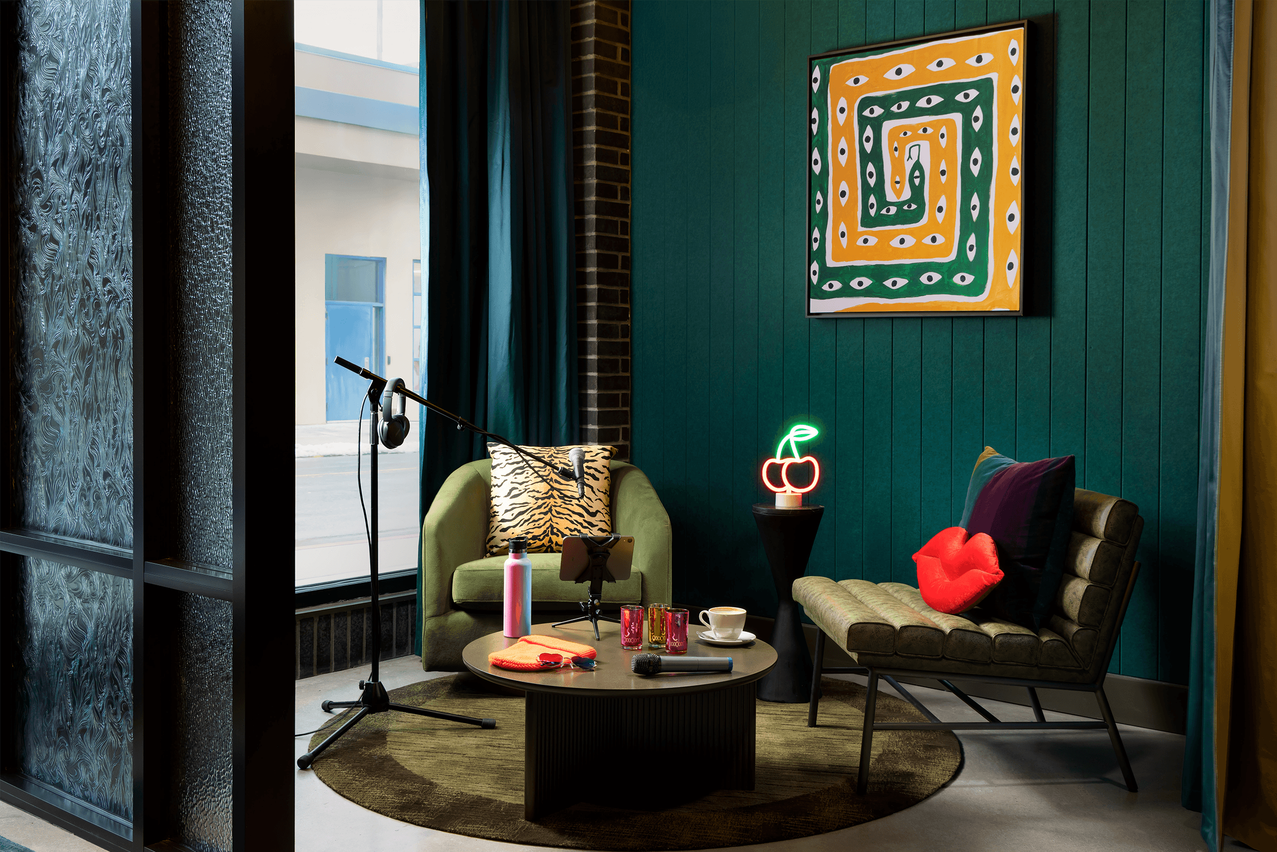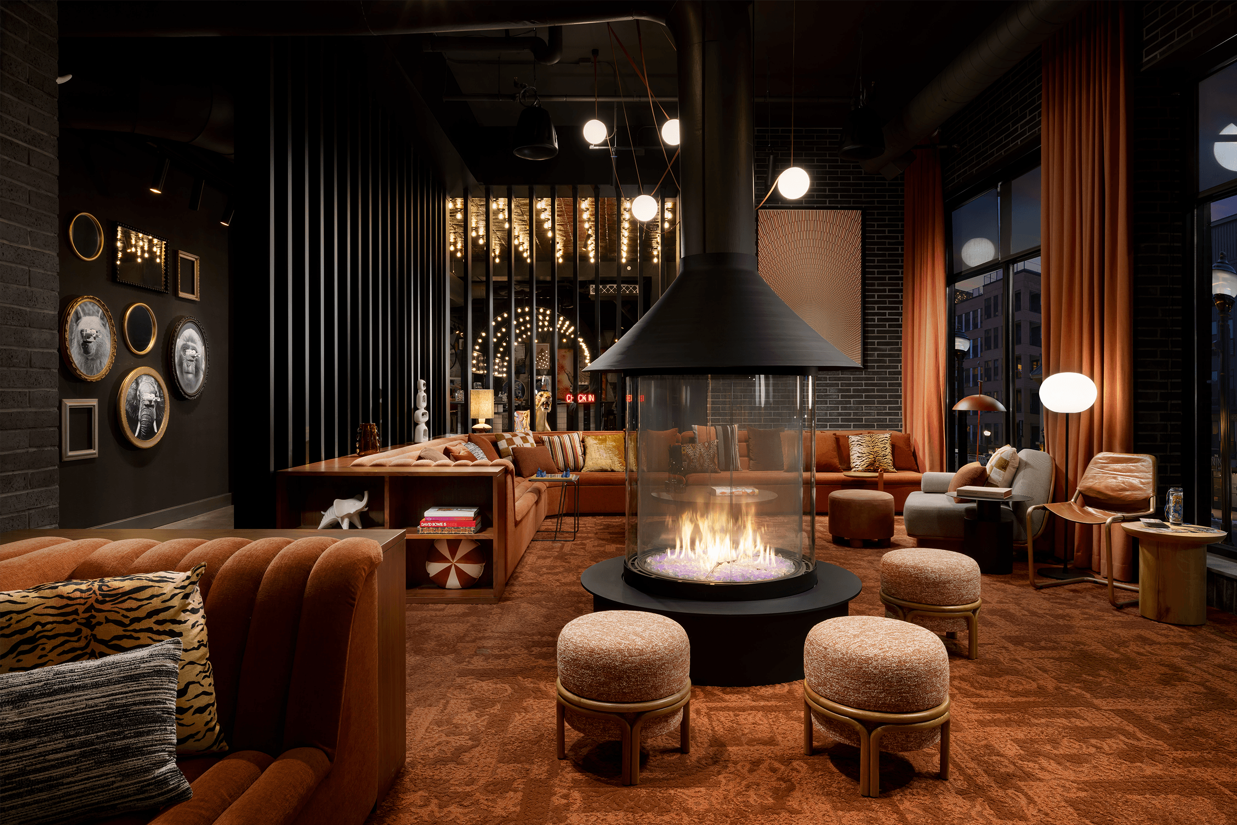 Though the hotel lobby appears to exist in a world of its own, playfully eccentric connections to Pennsylvania’s Dorney Park, decadent curtains alluding to the nearby theatre district, and stylish, avant-garde references to historic Hess’s department store anchor the building in a local context.