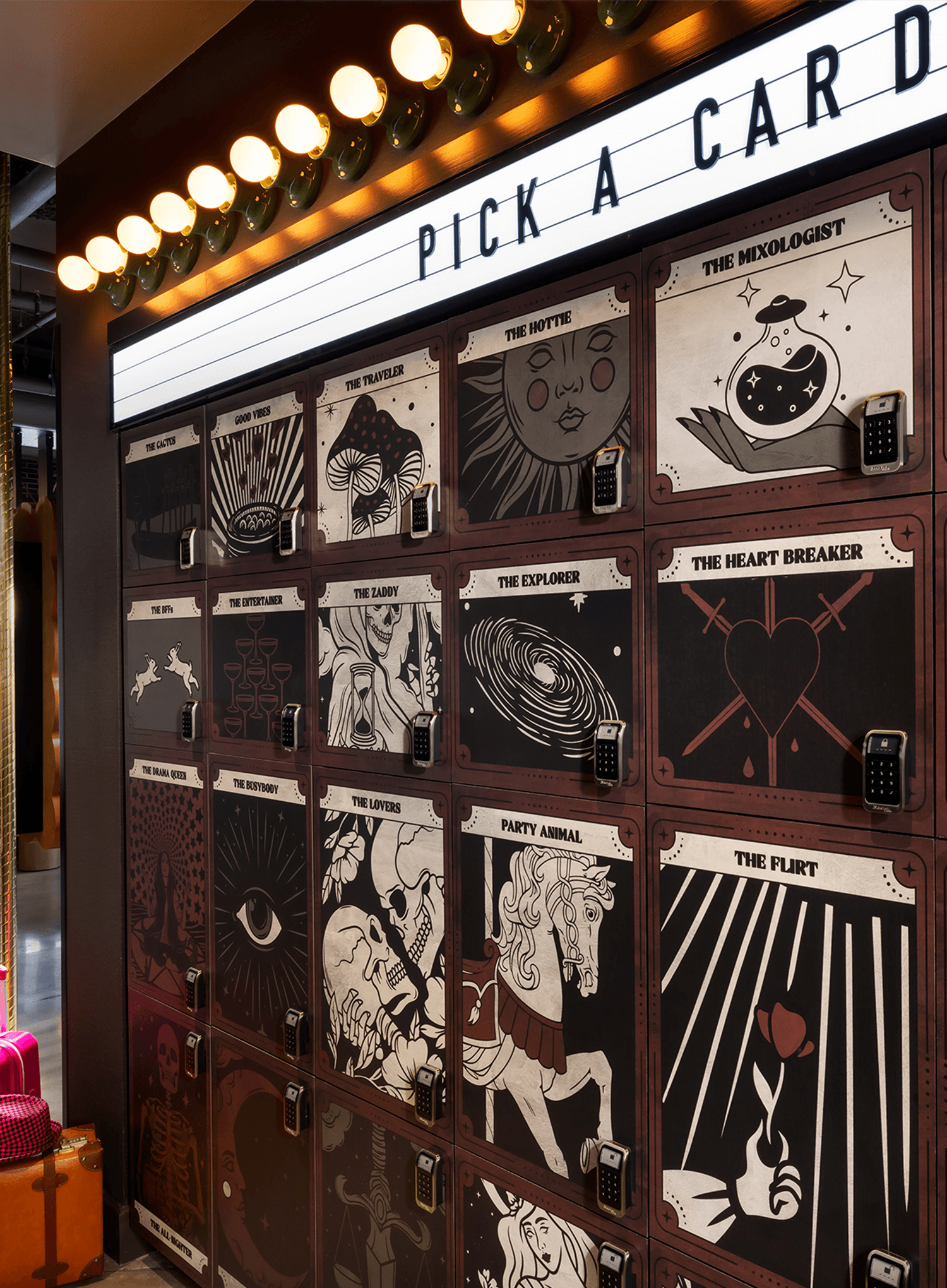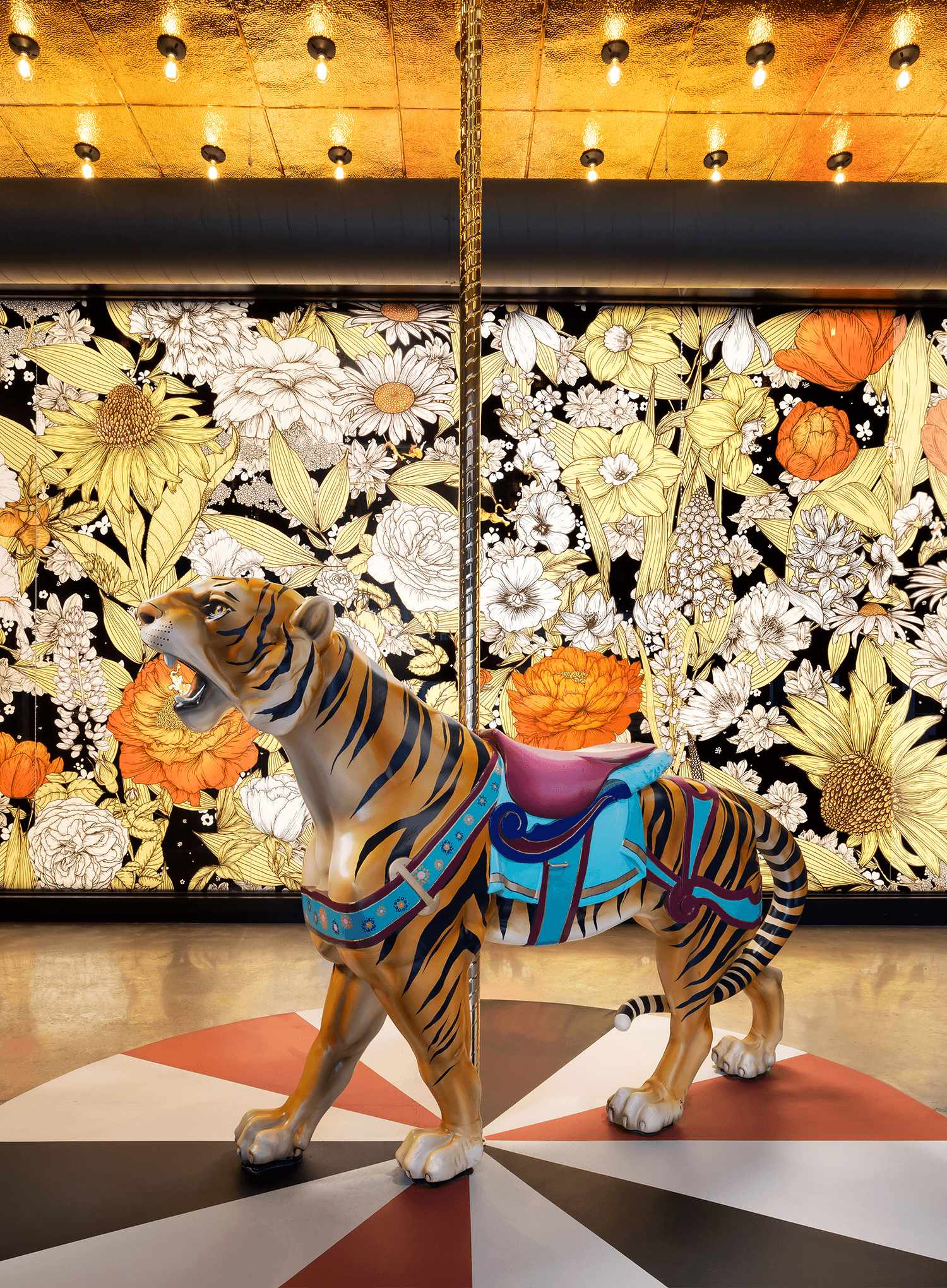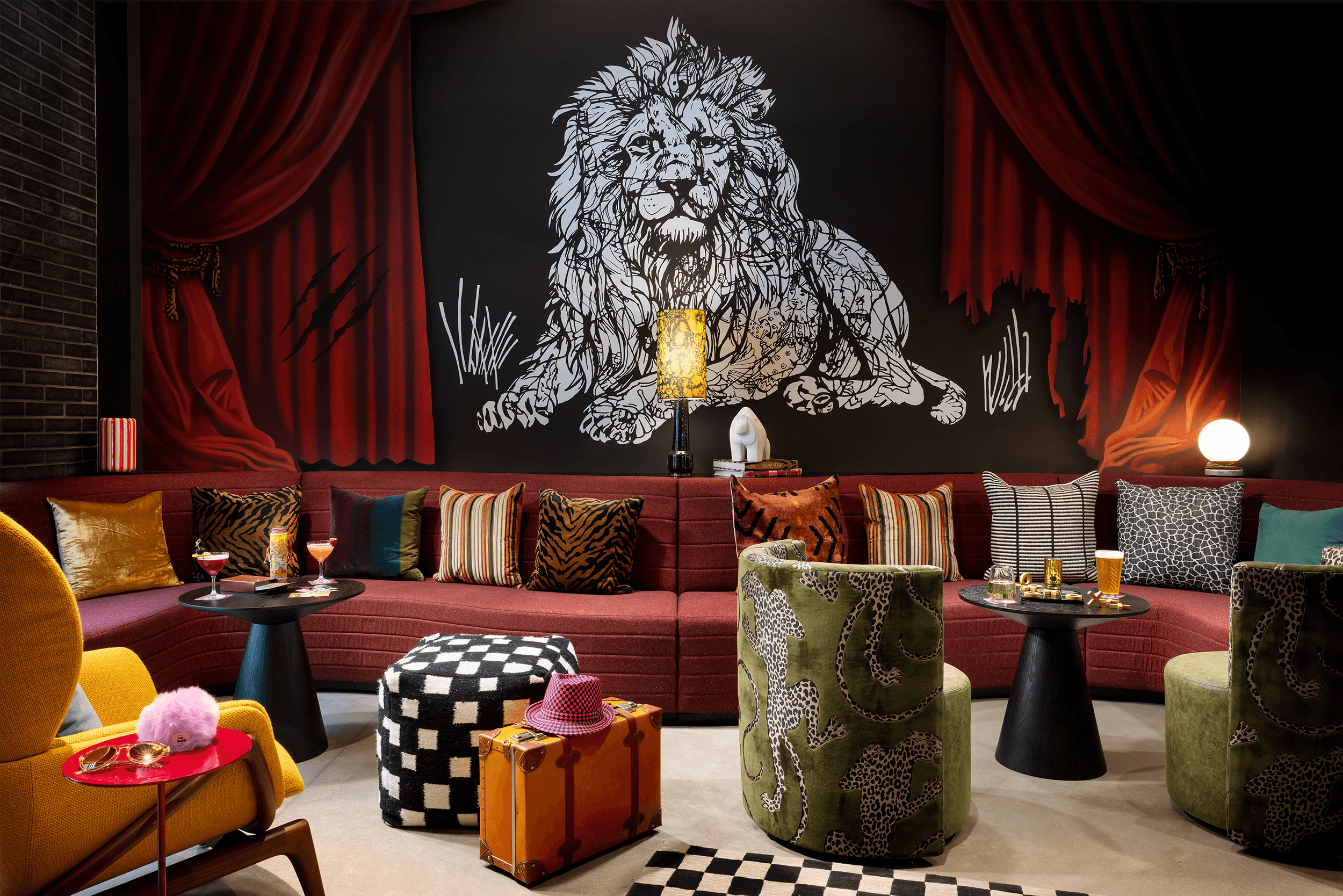 Filled with flamboyant, carnivalesque psychedelia, playful references to amusement park side show attractions - from the ‘Hall of Mirrors’ and ‘Ring of Fire’ to Foxy the Fortune Teller and assorted carousel animals - casts the hotel in the makeup of a theatrical, big-top funhouse.