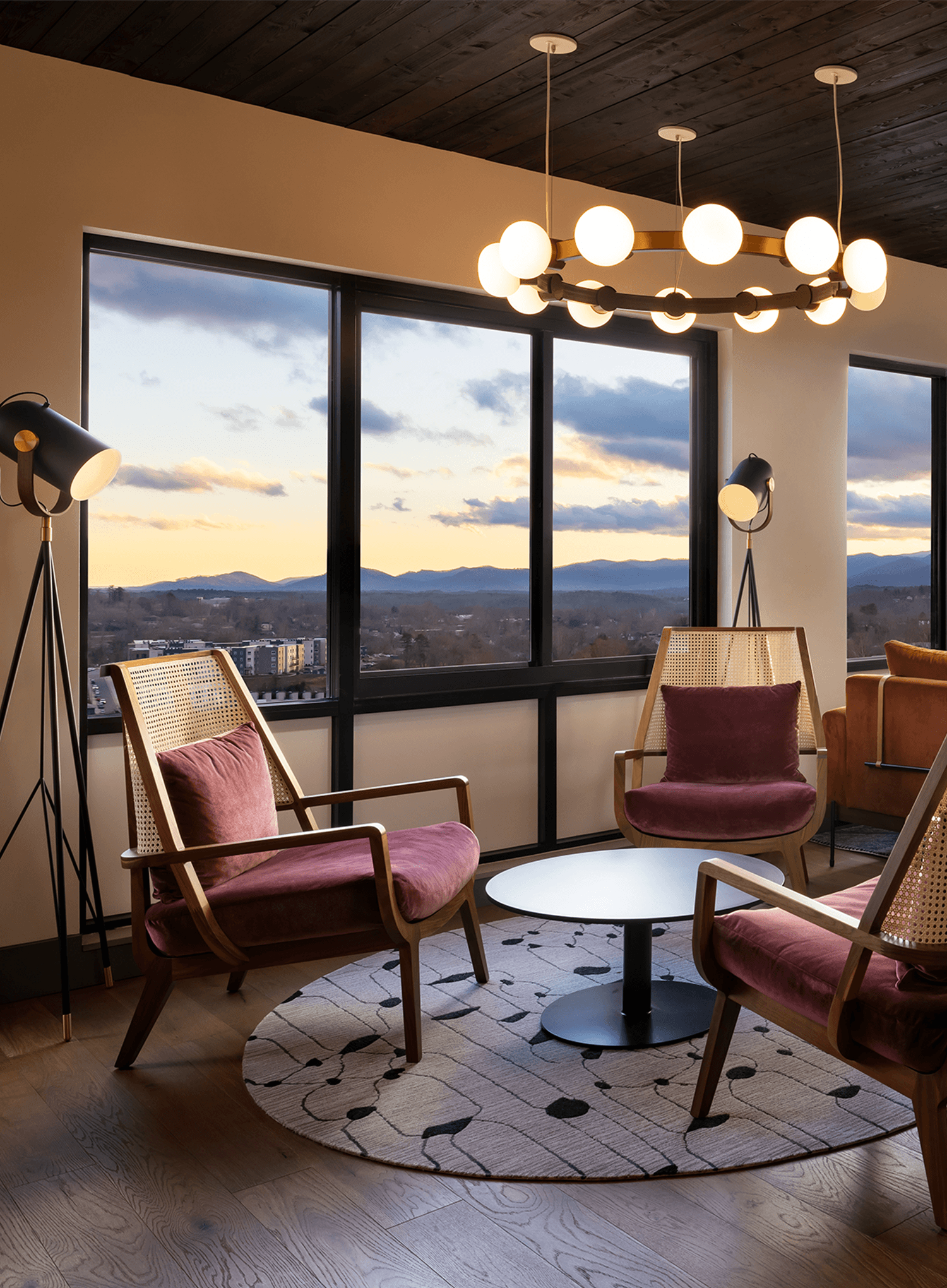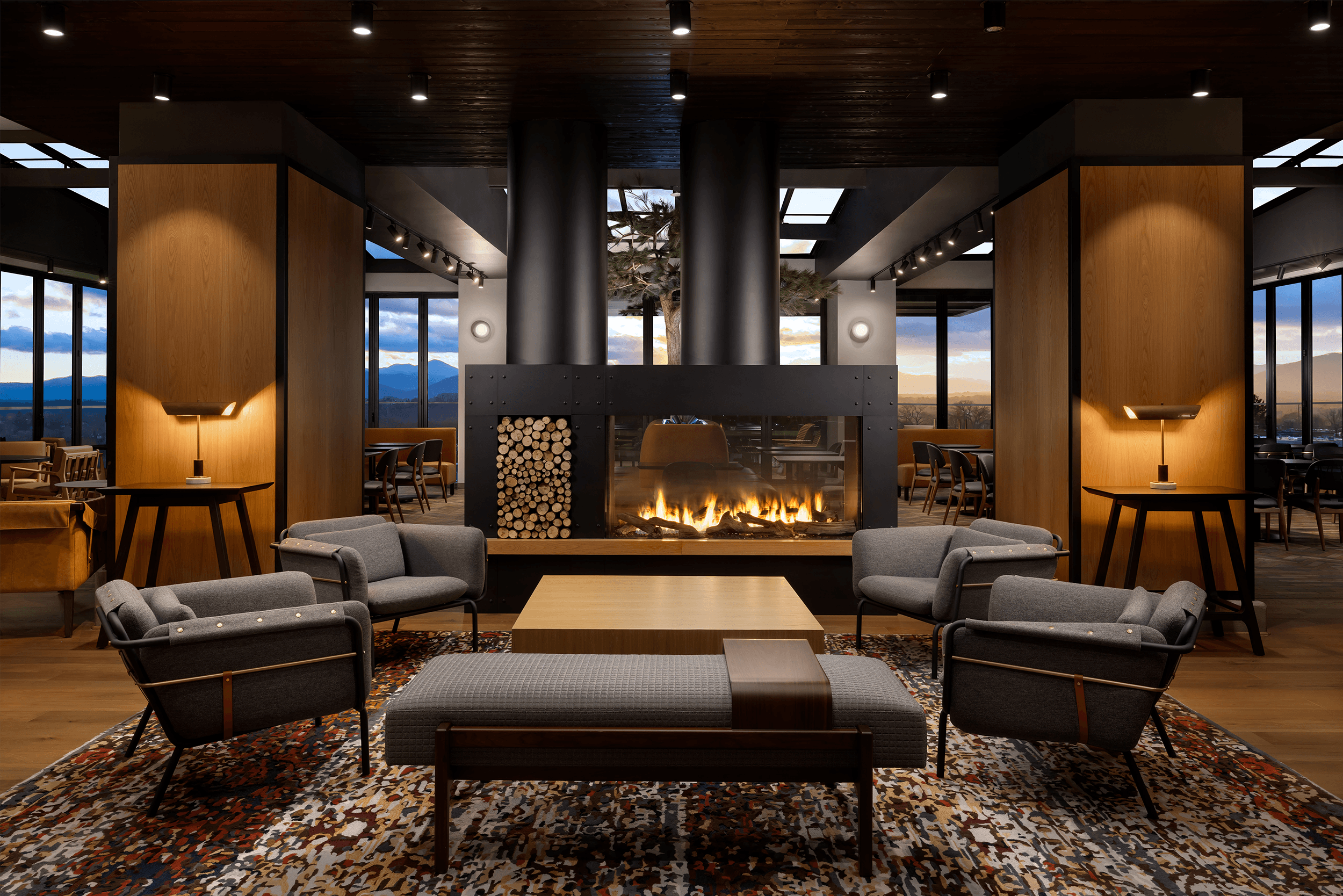 Woven textures in lounge furniture evoke the dried wheat and barley used to make liquor while rich amber and cognac wood tones immerse patrons in the warmth of American made spirits.